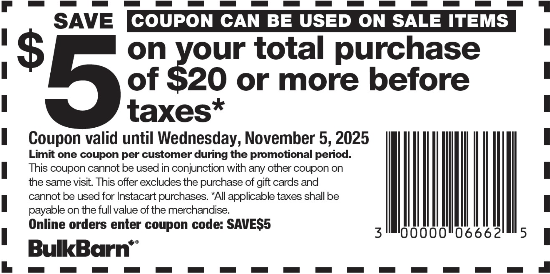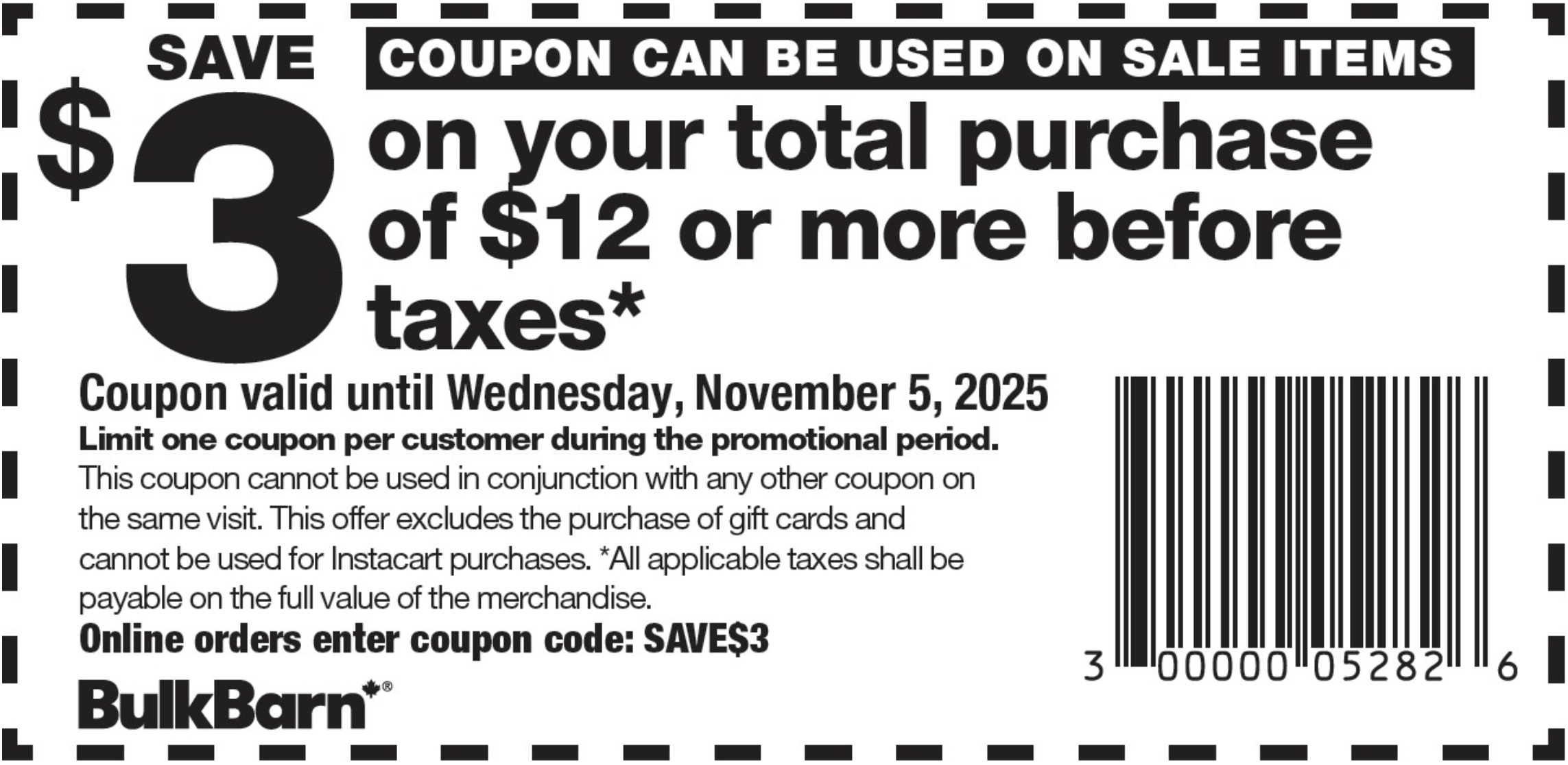 BulkBarn has coupons right now to get $3 off your purchase of $12+ and $5 off your purchase of $20+.